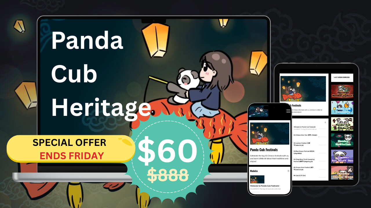 Trial membership: Online Access to all our e-courses, including Festivals, C-Drama, Jie Qi, and more! If after 30 days you find this isn't for you, we'll refund your membership fee.Â