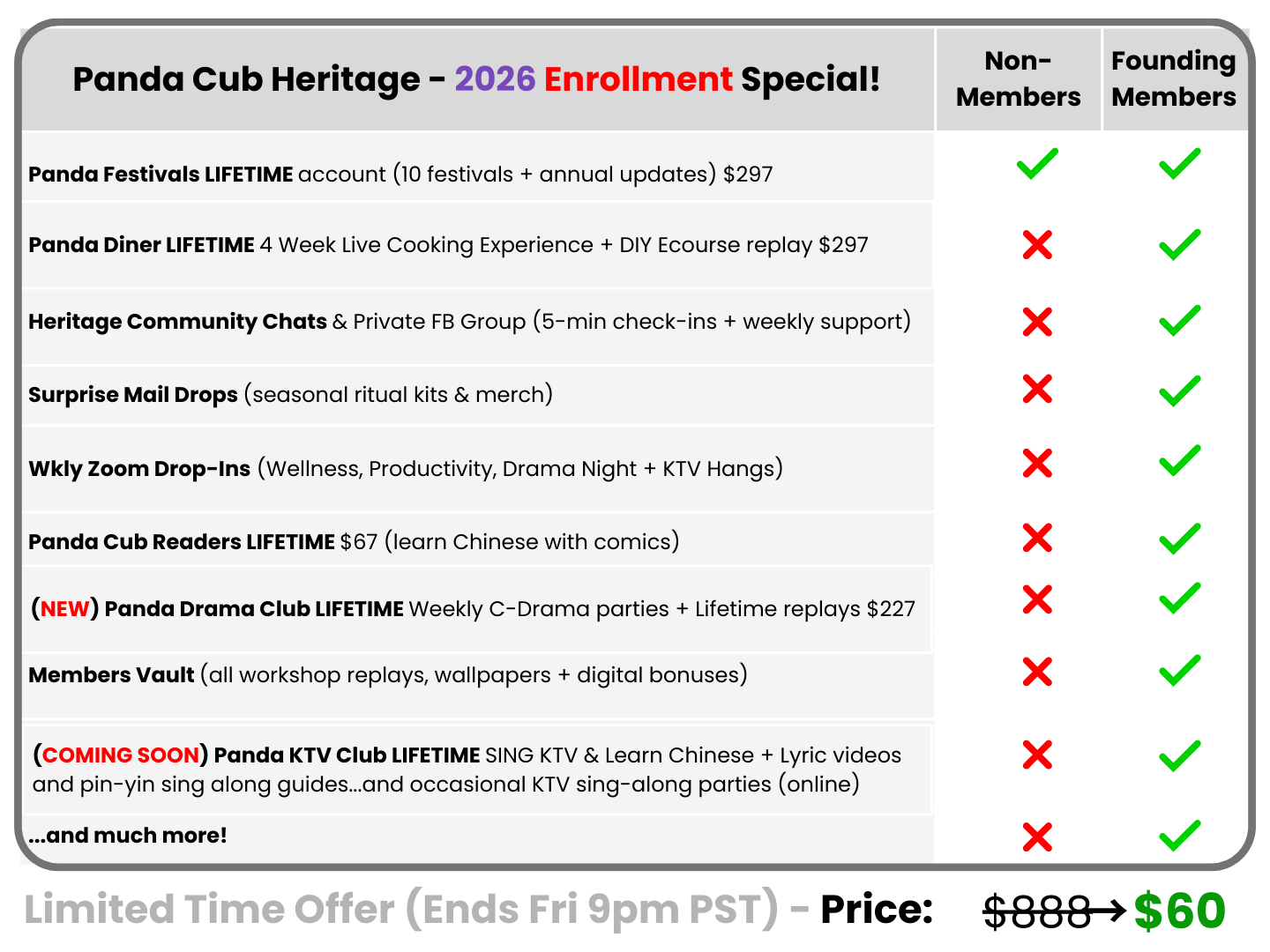 Join Panda Cub Heritage as a Founding Member ($60/mo or $30/mo Annual) and unlock FREE lifetime access to Panda Cub Festivals, Diner & Drama đžÂ  Special offer expires in:Â